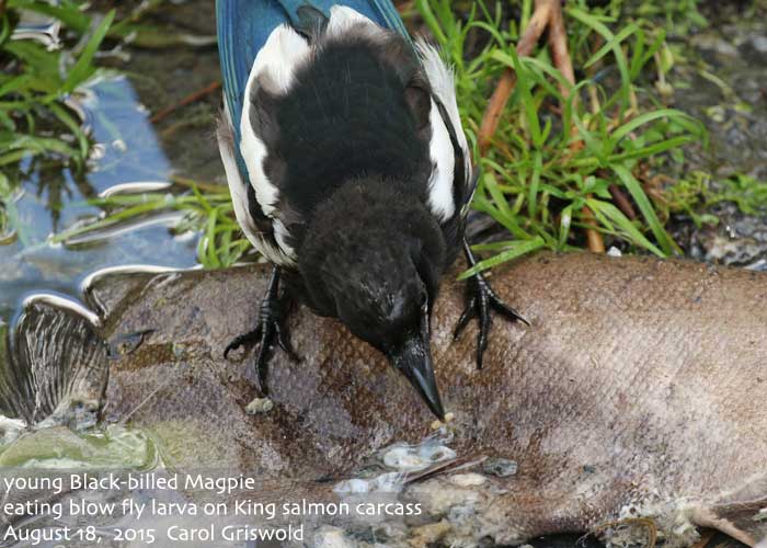 Author and naturalist Bob Armstrong, who alerted me to blow fly predation by birds, noted that my observations of the Black-billed Magpies and Glaucous-winged Gull bring the documented total of predatory bird species to around 14. There may even be a book forthcoming about salmon and blow flies in Alaska by blow fly experts. Who knew there was such a thing?