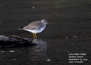 The excitement had barely settled down when another rarity, the Gray-tailed Tattler apparated on September 23 at Afognak Beach. According to Aaron Lang (thanks for these records data), there is one previous record for the Kenai Peninsula back on June 28, 1987. Amazingly, it was also discovered in Seward; not surprising, by Buzz Scher and Dave Sonneborn.