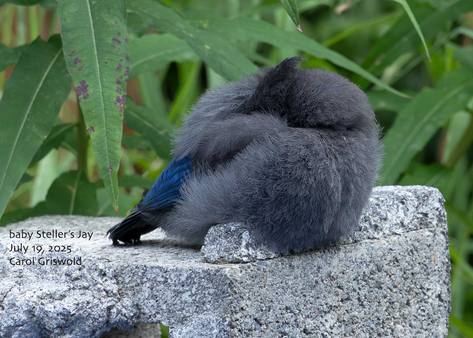 Back home, I found two adorable baby STELLER JAYS snoozing on the back deck, blue-gray balls of downy feathers with bright blue wing and tail feathers and a tiny dark crest. They still have their gaping baby bills. O, they were so tired! They hardly stirred when I suddenly appeared, then quickly dozed off again. It won’t be long before they become alert, perky rascals.