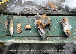 at home, a neighbor brought over an odd, desiccated collection: a smashed robin, flattened Bohemian waxwing, shriveled mouse, old bait herring, a hunk of congealed fat, and a dried up piece